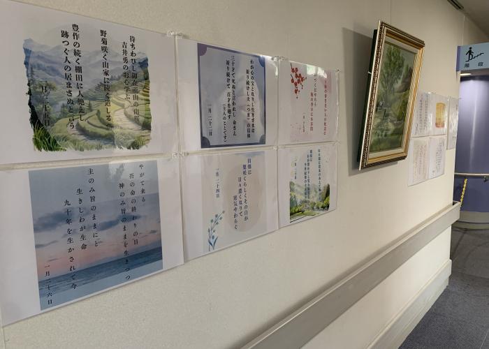緩和ケア病棟に入院されている患者さまで、 短歌・俳句を日々詠まれている方がいらっしゃいます。 日々感じたこと、周囲の方とのかかわり、自身の人生、などなど・・・本当に素敵な詩を詠まれており、 みなさまの目にも触れていただきたく、 病棟壁面に掲示させていただきました(*^_^*)✨✨ 病棟に来られた際は、是非ご覧ください。 ![]() ![]() |